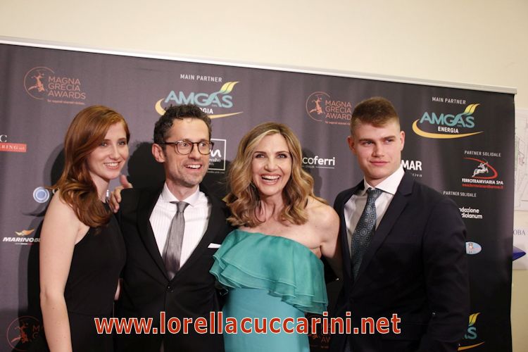 Lorella tra i suoi figli gemelli (Chiara e Giorgio) e Fabio Salvatore nel 2018 ai Magna Grecia Awards