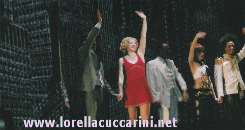 Lorella con Cesare Bocci e altri protagonisti della compagnia in scena al Teatro della Luna...