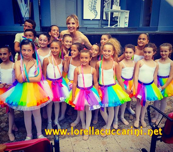 Lorella Cuccarini a Borgio Verezzi con un gruppo di ballerine della scuola locale, luglio 2017