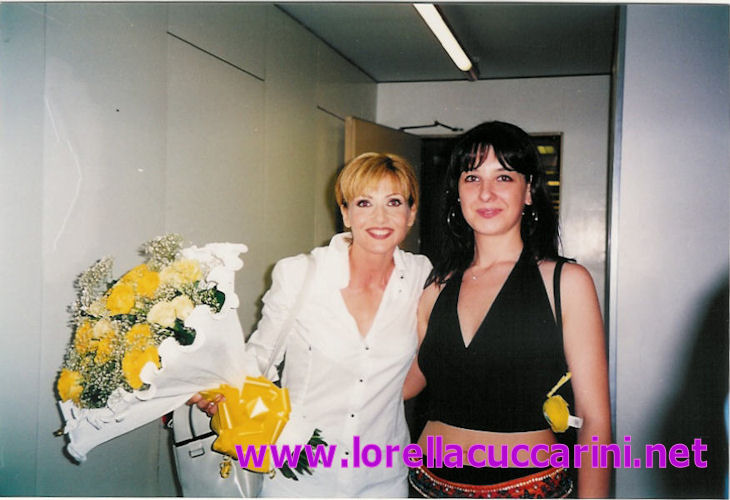 Lorella con Laura negli studi di Cologno Monzese, Mediaset, nel 2001 per il programma "La notte vola"